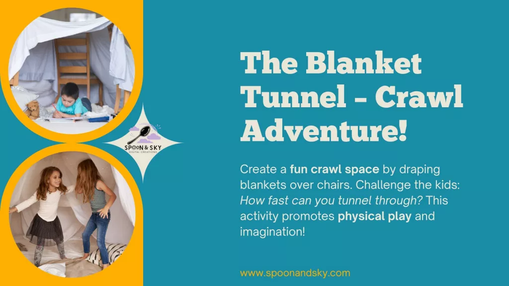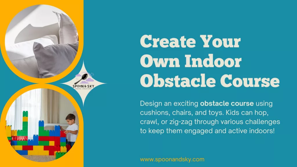 Use cushions, tape lines, stools, and blankets to make a course. Keep it simple: jump, crawl, balance, roll.