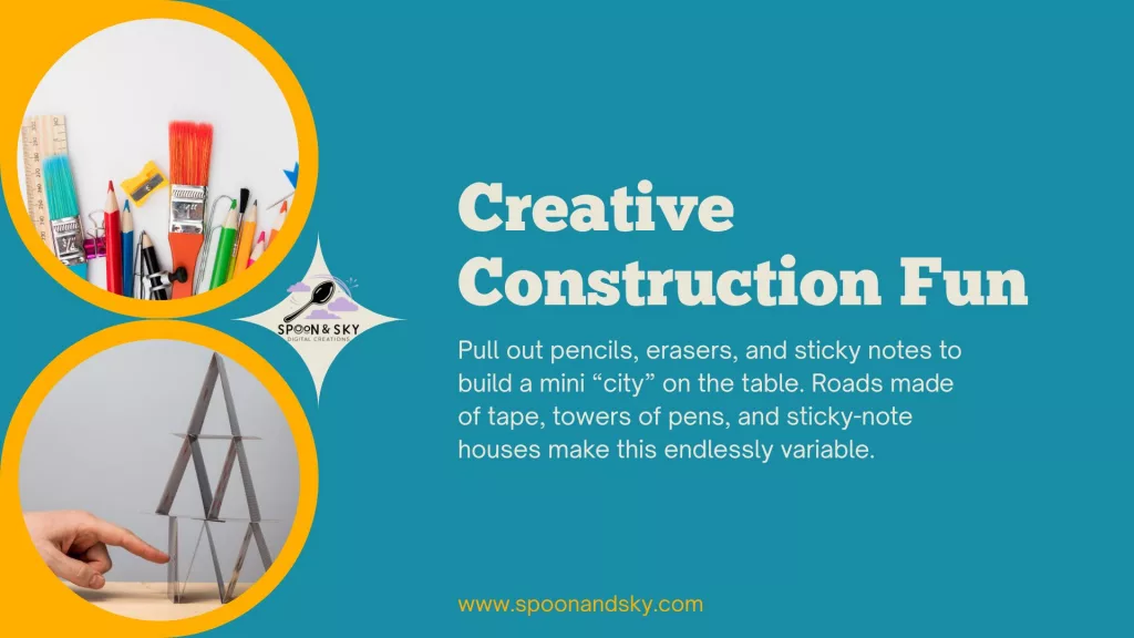 Pull out pencils, erasers, and sticky notes to build a mini “city” on the table. Roads made of tape, towers of pens, and sticky-note houses make this endlessly variable.