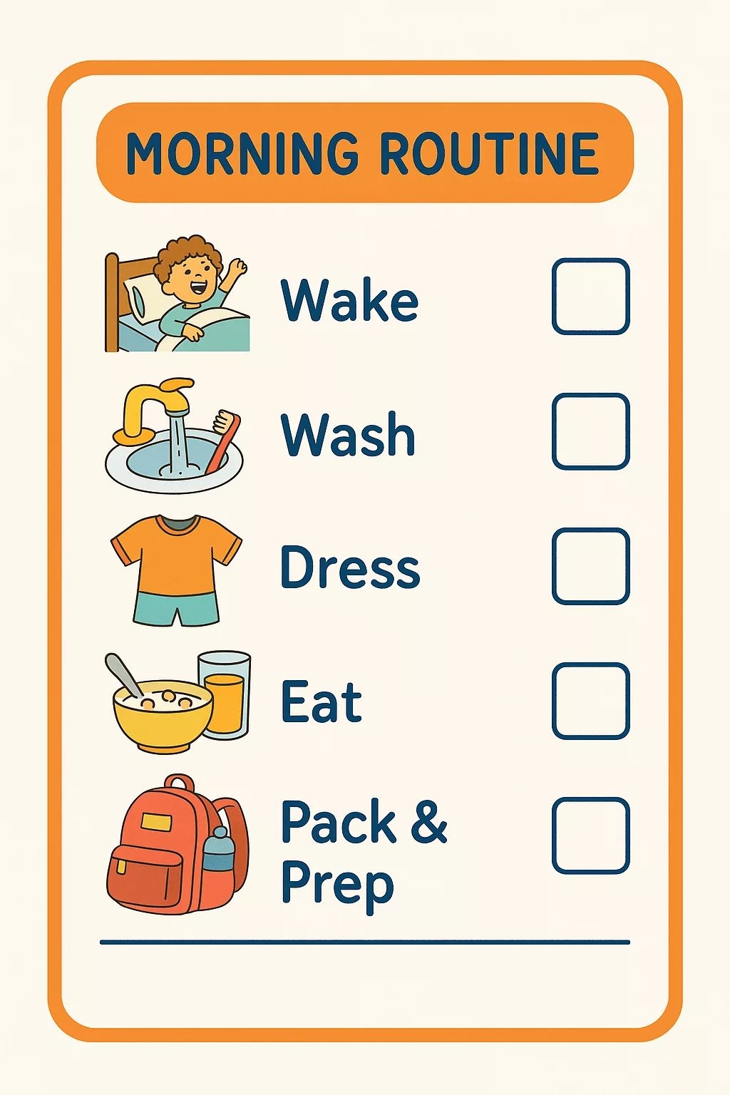 Every family’s morning looks different, but kids thrive when steps stay consistent. A predictable order helps them move through the morning without constant battles. Here’s a rhythm that works beautifully for ages 3–8: