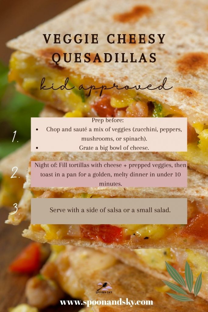 Fill tortillas with cheese + prepped veggies, then toast in a pan for a golden, melty dinner in under 10 minutes. Serve with a side of salsa or a small salad.