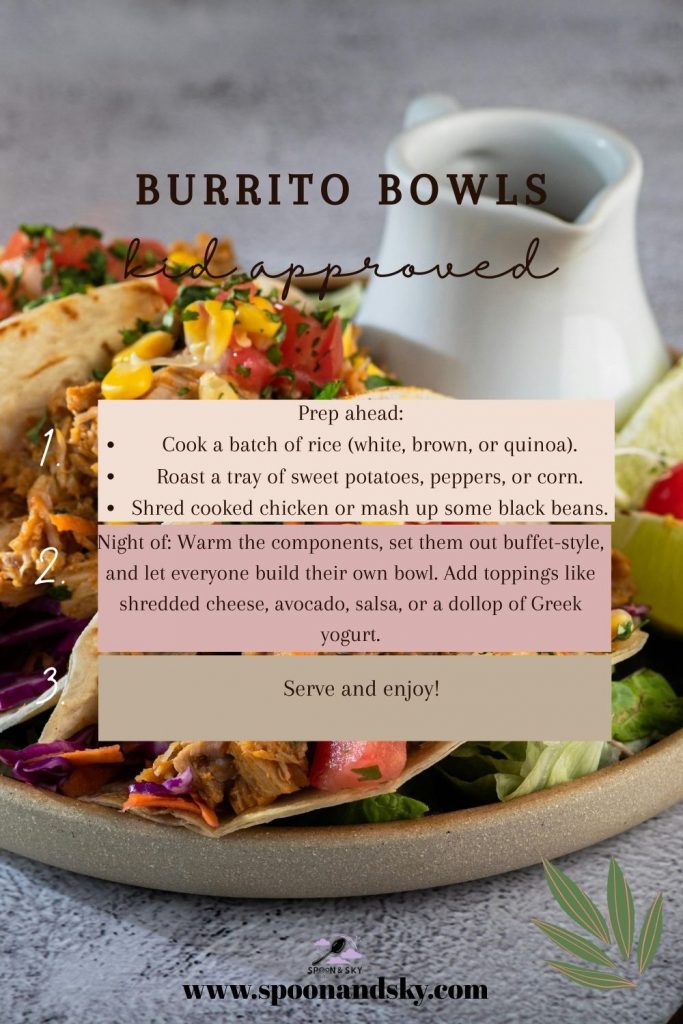 Warm the components, set them out buffet-style, and let everyone build their own bowl. Add toppings like shredded cheese, avocado, salsa, or a dollop of Greek yogurt.