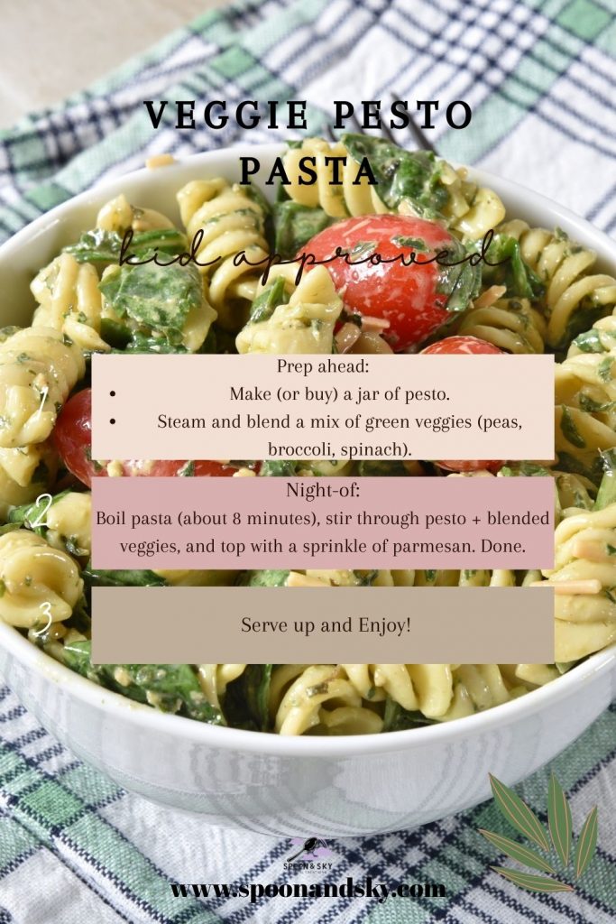 Boil pasta (about 8 minutes), stir through pesto + blended veggies, and top with a sprinkle of parmesan. Done.