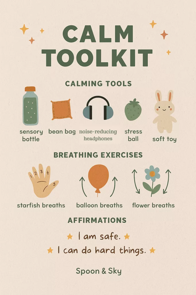 - Visual calm steps (1. Breathe, 2. Stretch, 3. Choose a tool)