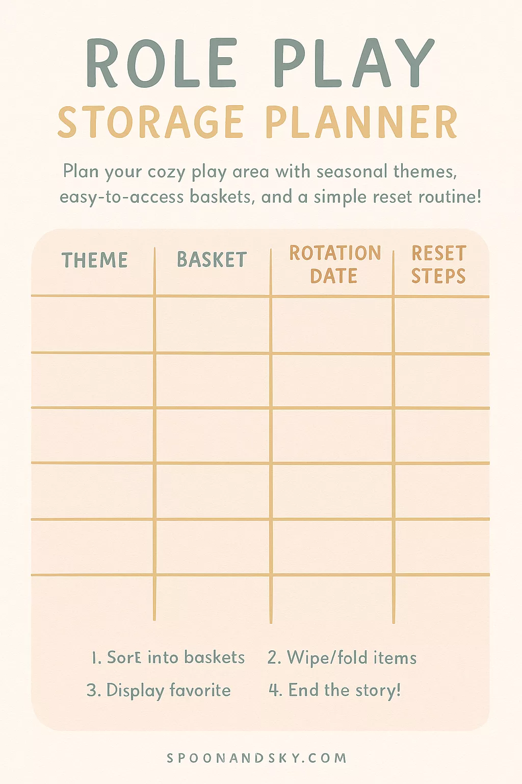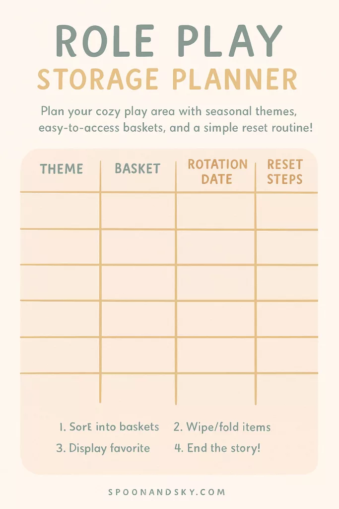 At Spoon & Sky, I believe imaginative play doesn’t have to mean disorganized chaos. With a little structure — and a lot of creativity — you can create a “play and store” system that nurtures imagination while keeping your home calm, accessible, and clutter-free.