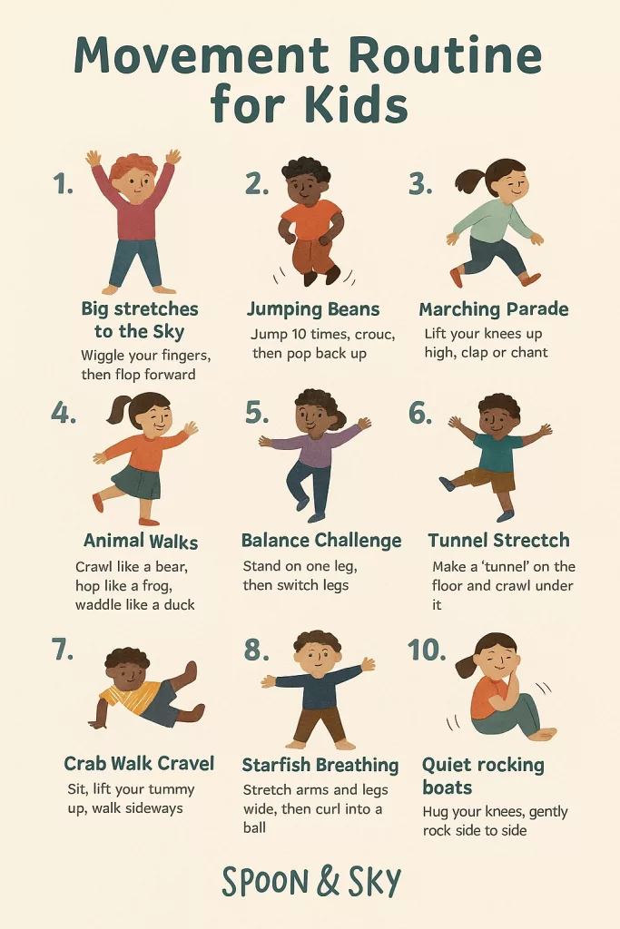 At Spoon & Sky, I believe in simple tools for joyful structure — and a short movement routine can do wonders for children’s emotional regulation, focus, and mood. Let’s explore why movement matters, then I’ll share a quick 10-step routine you can use anytime, anywhere.