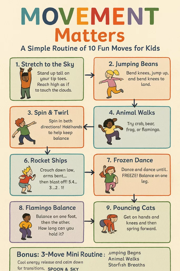 - Let Kids Choose: Build autonomy by letting children pick today’s moves from the list.