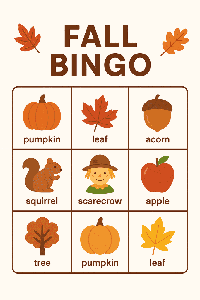 🪄 Try this: Use autumnal colours (red, orange, brown, gold) and label the leaves together. Ask, “What shapes can you see? Do you notice the veins or edges?”