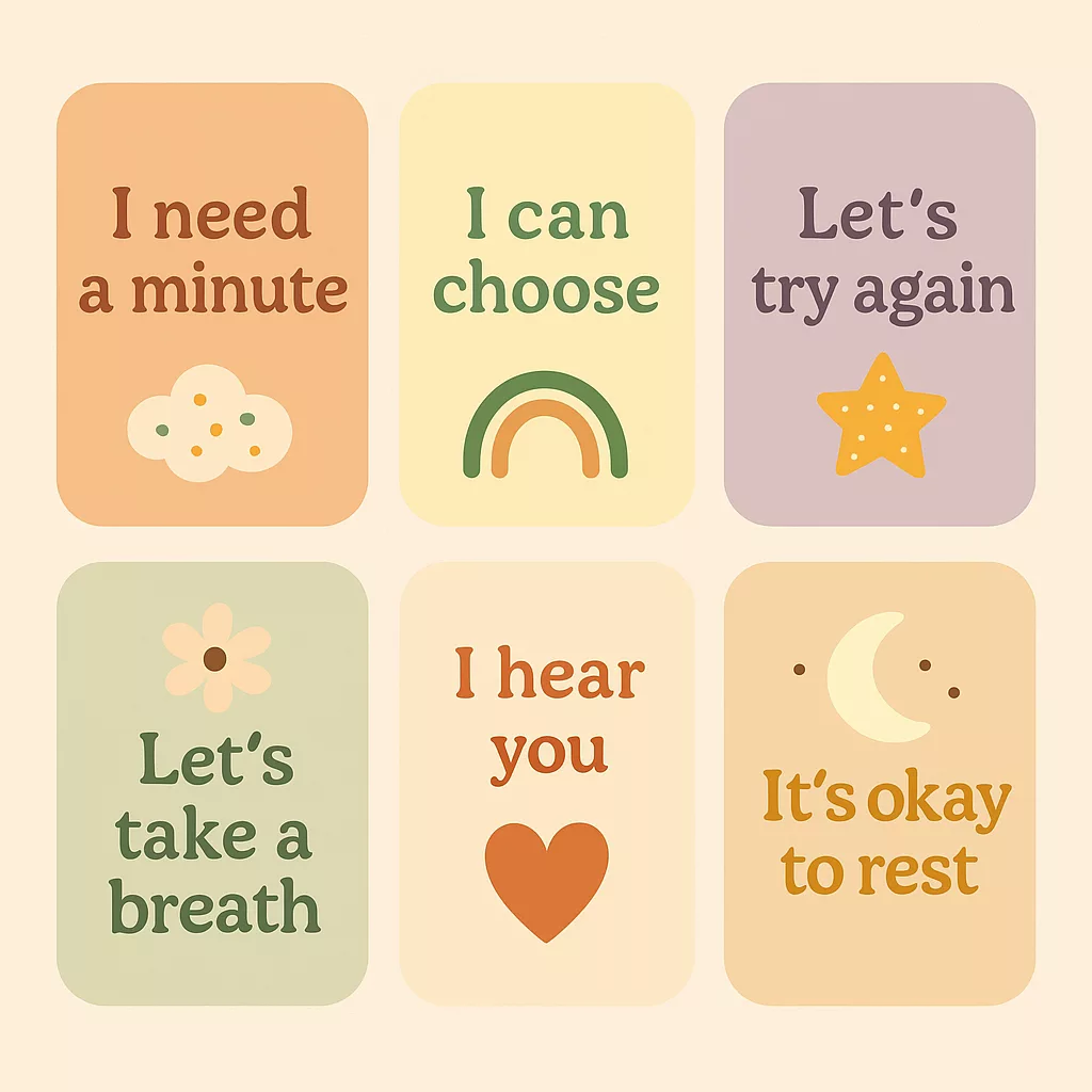 🪄 Download our printable “Choice & Calm Cards” — gentle, illustrated prompts with affirming phrases like “I need a minute,” “I can choose,” and “Let’s try again,” designed to help children communicate their needs respectfully.