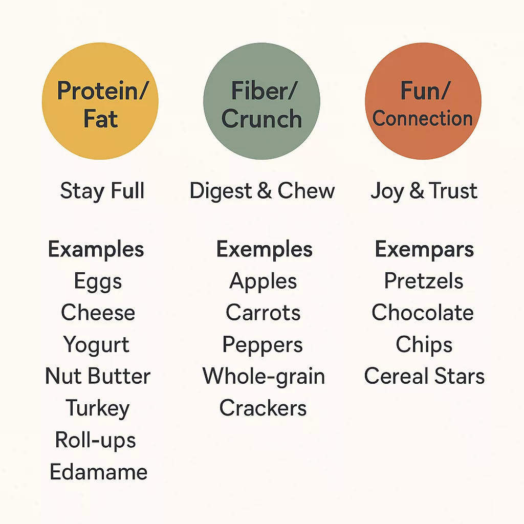 | Protein / Fat | Stay Full | Eggs, Cheese, Yogurt, Nut Butter, Turkey Roll-ups, Edamame |