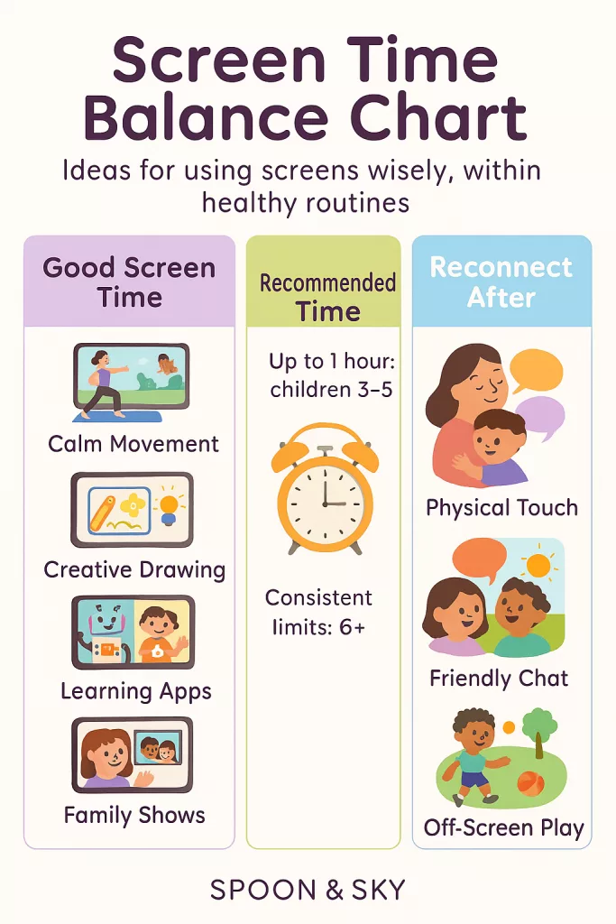 It can also help to invite your child to notice how they feel after screens versus after quiet play. Ask: “Does your body feel buzzy or sleepy right now?” Helping them tune into their own sensations teaches lifelong awareness — the foundation of self-regulation.